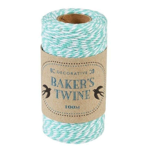 A roll of decorative baker's twine in teal and white. Perfect for arts and crafts, gift wrapping.