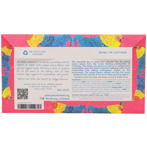 A delicious dark chocolate combined with a unique smoky crunch and a hint of maple syrup, wrapped beautifully in Philippa Morrisons bright artwork, made right here in the UK. The recyclable paper envelope features a fun, fluro design with a mythical creature, whilst the bar inside is wrapped in bright coloured foil. The design is then finished with the ARTHOUSE Unlimited signature foiled frame. A must-have treat for any art lovers, chocoholics and good-cause supporters everywhere!