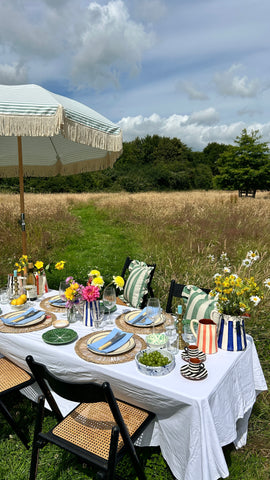 Classic stripe tableware that will make your tablescape pop. Handmade in Portugal by Casa Cubista. Some marks in the glaze are natural and expected, as is some crazing. This will not affect the use or durability of the pieces.
