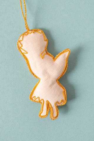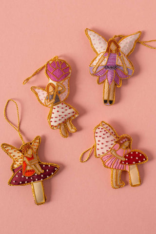 This delicate decoration features a pretty fairy holding a purple flower. This piece has been decorated with intricate metal embroidery and glass beads to create a beautiful design. Made in India using cotton fabric and filled with recycled plastic, this gorgeous decoration is perfect for your festive tree, or all year round.