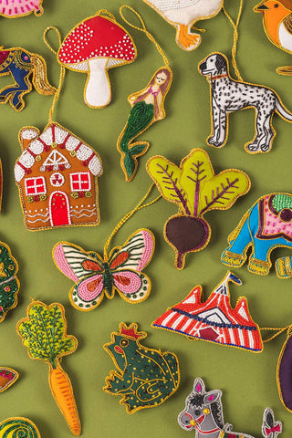 A butterfly in delicate colours and dainty patterns; celebrate these stunning creatures with this beautiful decoration. This piece has been decorated with intricate metal embroidery and glass beads to create a colourful design. Made in India using cotton fabric and filled with recycled plastic, this elegant decoration is perfect for your festive tree, or all year round.