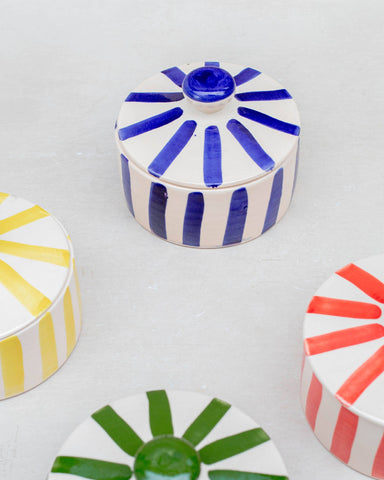A versatile striped ceramic lidded pot, handmade in Ourika, a village in the High Atlas Mountains near Marrakech.